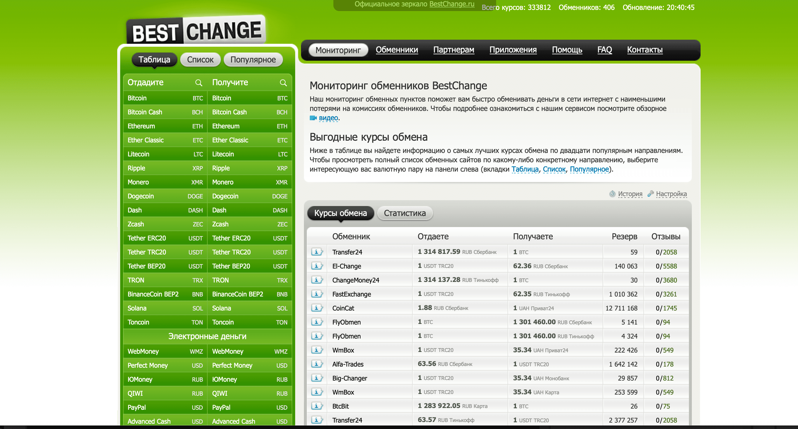 сервис мониторинга криптообменников предоставляет удобную систему рейтингов и отзывов о каждом обменном пункте. Вы можете выбрать валюту, которую хотите отдать, и ту, которую хотите получить. После этого система автоматически покажет список обменных пунктов, отсортированных по выгодному курсу и доступному резерву валюты. Выберите подходящий обменник и кликните на него, чтобы перейти на сайт и завершить операцию обмена.