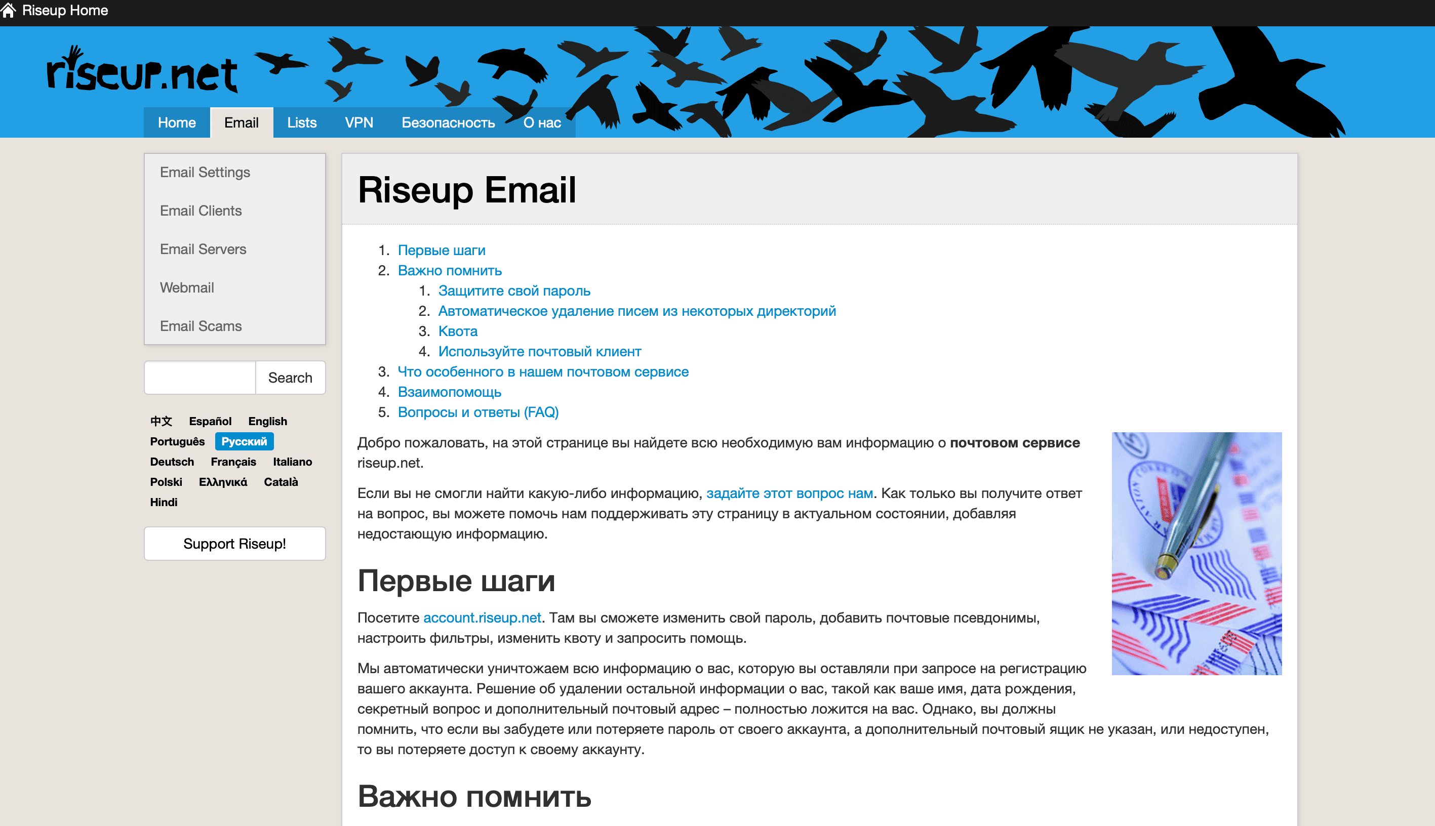 RISEUP — это сервис, ориентированный на обеспечение конфиденциальности пользователей. Он намеренно не собирает личную информацию и тщательно защищает данные от доступа со стороны властей. Вся информация на серверах Riseup.net хранится в зашифрованном виде. Для регистрации в настоящее время требуется инвайт.
